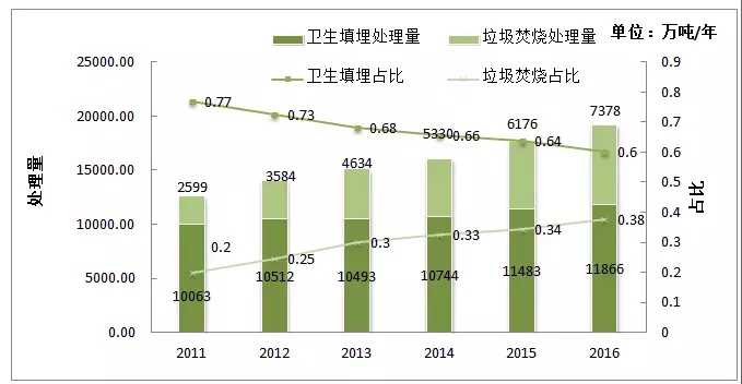 2011-2016 城市垃圾處理量及占比走勢(shì) (注:數(shù)據(jù)來自住建部國家統(tǒng)計(jì)年鑒)