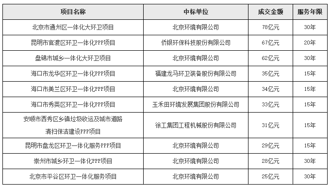 環(huán)衛(wèi)一體化25億元以上項目匯總表
