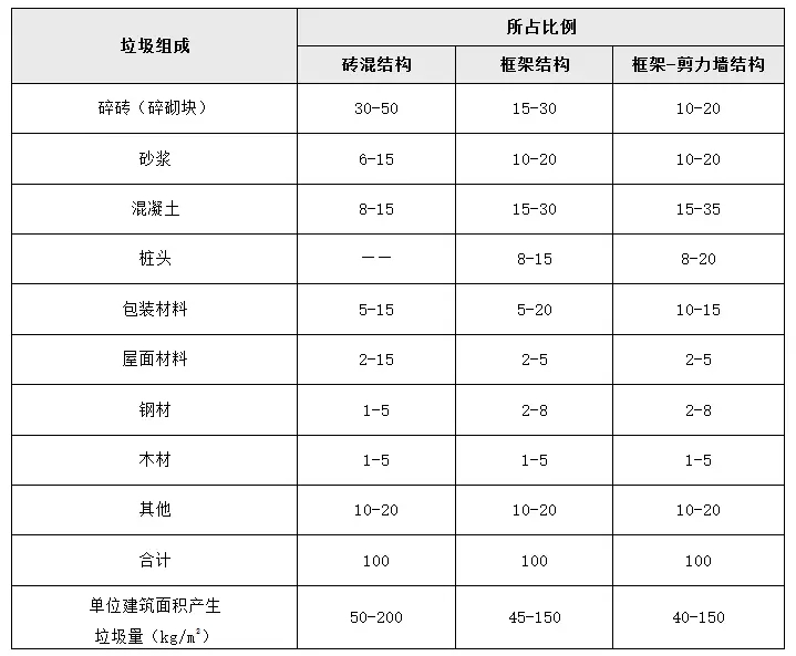 舊建筑物拆除垃圾的組成與建筑物的種類有關(guān):廢棄的舊民居建筑中,磚塊、瓦礫、混凝土塊、渣土約占80%,其余為木料、碎玻璃、石灰、金屬、包裝物、防水材料、各類電信線和電源線、塑料制品等;廢棄的舊工業(yè)、樓宇建筑中,混凝土塊約占50%~60%,其余為金屬、磚塊、砌塊、塑料制品等。對(duì)不同結(jié)構(gòu)形式的建筑工地,垃圾組成比例略有不同,而垃圾數(shù)量因施工管理情況不同在各工地差異很大。