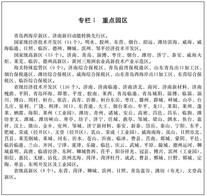 以淄博等14市國家和省級(jí)經(jīng)濟(jì)技術(shù)開發(fā)區(qū)、高新技術(shù)產(chǎn)業(yè)開發(fā)區(qū)以及海關(guān)特殊監(jiān)管區(qū)等為重點(diǎn),創(chuàng)新園區(qū)管理運(yùn)營機(jī)制,明確各市產(chǎn)業(yè)發(fā)展方向,培育特色經(jīng)濟(jì)和優(yōu)勢產(chǎn)業(yè),打造若干具有核心競爭力的區(qū)域經(jīng)濟(jì)增長點(diǎn)。