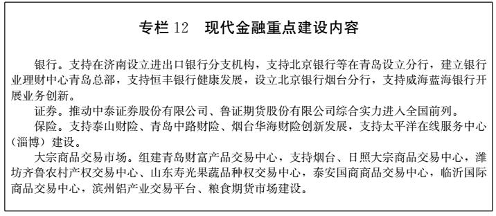 推動(dòng)金融業(yè)務(wù)創(chuàng)新。加快完善金融市場、金融組織、金融產(chǎn)品和服務(wù)模式,更好滿足實(shí)體經(jīng)濟(jì)和人民群眾多樣化的金融需求。鼓勵(lì)利用互聯(lián)網(wǎng)、大數(shù)據(jù)、人工智能等,進(jìn)行金融業(yè)務(wù)流程改造和產(chǎn)品創(chuàng)新。積極發(fā)展養(yǎng)老金融、教育金融、文化金融、旅游金融、農(nóng)村金融等新型金融服務(wù)。規(guī)范發(fā)展互聯(lián)網(wǎng)金融、區(qū)塊鏈、人工智能等領(lǐng)域的新型金融業(yè)態(tài)。支持小額貸款公司、典當(dāng)、融資租賃、商業(yè)保理等金融組織創(chuàng)新、可持續(xù)發(fā)展。統(tǒng)籌發(fā)展介于現(xiàn)貨與期貨之間的大宗商品交易業(yè)務(wù),打造具有全國影響力的交易場所。支持濟(jì)南推進(jìn)新舊動(dòng)能轉(zhuǎn)換金融創(chuàng)新發(fā)展試點(diǎn),開展金融服務(wù)實(shí)體經(jīng)濟(jì)改革創(chuàng)新。支持煙臺(tái)開展基金管理服務(wù)專項(xiàng)改革創(chuàng)新,青島建設(shè)財(cái)富管理金融綜合改革試驗(yàn)區(qū)。支持棗莊、臨沂等市開展普惠金融改革創(chuàng)新,探索完善區(qū)域普惠金融服務(wù)體系。支持濰坊建設(shè)文化藝術(shù)金融綜合試驗(yàn)區(qū)、德州舉辦京津冀魯資本技術(shù)交易大會(huì)。