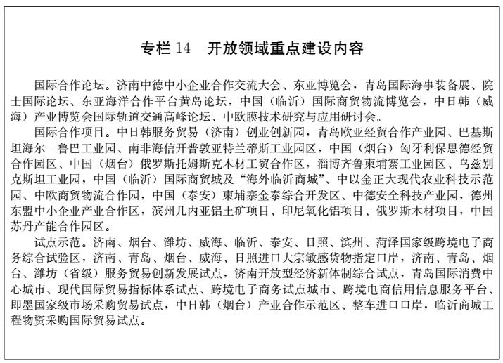 構(gòu)建開放型經(jīng)濟(jì)新體制。充分借鑒自由貿(mào)易試驗(yàn)區(qū)改革試點(diǎn)經(jīng)驗(yàn),在濟(jì)南、青島、煙臺(tái)市,依托國家級(jí)新區(qū)、國家級(jí)經(jīng)濟(jì)技術(shù)開發(fā)區(qū)、國家級(jí)高新技術(shù)開發(fā)區(qū)、海關(guān)特殊監(jiān)管區(qū),以及濟(jì)南新舊動(dòng)能轉(zhuǎn)換先行區(qū),加快體制機(jī)制創(chuàng)新。支持青島積極創(chuàng)造條件,探索建設(shè)自由貿(mào)易港。支持濟(jì)南開展構(gòu)建開放型經(jīng)濟(jì)新體制綜合試點(diǎn)。推動(dòng)濟(jì)寧、日照、淄博、青島空港、即墨等綜合保稅區(qū)盡早獲批,支持其他符合條件的市申建海關(guān)特殊監(jiān)管區(qū)域,推進(jìn)現(xiàn)有海關(guān)特殊監(jiān)管區(qū)域延伸服務(wù)功能。推進(jìn)威海中韓自貿(mào)區(qū)地方經(jīng)濟(jì)合作示范區(qū)、中韓(煙臺(tái))產(chǎn)業(yè)園建設(shè)。全面實(shí)行準(zhǔn)入前國民待遇加負(fù)面清單管理制度,加強(qiáng)外商投資企業(yè)事中事后監(jiān)管,探索“無感知”和“低感知”監(jiān)管方式。推行“服務(wù)大使”制度,加強(qiáng)重點(diǎn)外資企業(yè)點(diǎn)對點(diǎn)直通包辦服務(wù)。擴(kuò)大服務(wù)業(yè)對外開放,根據(jù)國家部署,有序放開育幼養(yǎng)老、建筑設(shè)計(jì)、會(huì)計(jì)審計(jì)、商貿(mào)物流、電子商務(wù)等服務(wù)業(yè)領(lǐng)域準(zhǔn)入限制。開展跨境電子商務(wù)人民幣結(jié)算、跨境資產(chǎn)轉(zhuǎn)讓政策創(chuàng)新和融資租賃試點(diǎn)。
