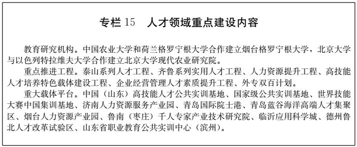 完善人才培養(yǎng)機(jī)制。積極推進(jìn)世界一流大學(xué)和一流學(xué)科建設(shè),爭取國家支持建設(shè)中國康復(fù)大學(xué)、中國能源大學(xué),加快齊魯工業(yè)大學(xué)、齊魯醫(yī)科大學(xué)建設(shè)。實(shí)施新工科優(yōu)先發(fā)展計(jì)劃,增設(shè)面向新經(jīng)濟(jì)、新產(chǎn)業(yè)的學(xué)科專業(yè),建設(shè)新型高端智庫,造就一大批戰(zhàn)略科技人才、科技領(lǐng)軍人才、青年科技人才和高水平創(chuàng)新團(tuán)隊(duì)。鼓勵(lì)本科高校、職業(yè)院校(含技工院校)和培訓(xùn)機(jī)構(gòu)開展技術(shù)技能培訓(xùn)、創(chuàng)業(yè)創(chuàng)新培訓(xùn),建設(shè)職業(yè)教育創(chuàng)新發(fā)展試驗(yàn)區(qū),籌建山東創(chuàng)業(yè)大學(xué)。傳承弘揚(yáng)勞模精神、工匠精神,打造知識(shí)型、技能型、創(chuàng)新型勞動(dòng)者大軍。大力倡導(dǎo)企業(yè)家精神,依法保護(hù)企業(yè)家的創(chuàng)新收益和財(cái)產(chǎn)權(quán),培養(yǎng)造就具有戰(zhàn)略思維、國際視野和勇于創(chuàng)新的企業(yè)家和經(jīng)營管理人才隊(duì)伍。