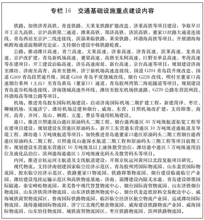 交通基礎(chǔ)設(shè)施。積極融入國家綜合交通網(wǎng),暢通省內(nèi)外運(yùn)輸網(wǎng)絡(luò),打造交通強(qiáng)國戰(zhàn)略山東示范區(qū)。鐵路。加快魯南高鐵、濟(jì)萊臨高鐵建設(shè),打造“三環(huán)四橫六縱”的快速鐵路網(wǎng)絡(luò),建設(shè)大萊龍擴(kuò)能改造、聊泰、淄東等鐵路項(xiàng)目,完善“四縱四橫”貨運(yùn)鐵路網(wǎng)。公路。實(shí)施濟(jì)青、京滬(山東段)、沈海(山東段)等大運(yùn)量路段改擴(kuò)建工程,推進(jìn)普通國省道低標(biāo)準(zhǔn)路段改造,按照一條綜合運(yùn)輸通道至少配置一條免費(fèi)快速干線公路的原則,開展全省干線快速路網(wǎng)工程規(guī)劃建設(shè),大力推進(jìn)“四好農(nóng)村路”建設(shè)。軌道交通。推進(jìn)濟(jì)南、青島地鐵和輕軌建設(shè),規(guī)劃建設(shè)淄博、煙臺(tái)、濰坊、濟(jì)寧、臨沂、威海等市軌道交通。機(jī)場。加強(qiáng)民用運(yùn)輸機(jī)場和通用機(jī)場建設(shè),完善機(jī)場布局,提高機(jī)場資源配置效率,構(gòu)建現(xiàn)代民用航空體系。港口。以資本為紐帶、以市場為導(dǎo)向,整合港口資源,帶動(dòng)航運(yùn)協(xié)同合作及一體化運(yùn)營,打造現(xiàn)代化港口群。按程序成立省港口發(fā)展管理委員會(huì),作為省政府議事協(xié)調(diào)機(jī)構(gòu),對港口群進(jìn)行統(tǒng)一規(guī)劃,實(shí)現(xiàn)港口間合理分工和良性互動(dòng)。支持各市通過多種方式參與港口運(yùn)營,打通出海通道。加快港口公用基礎(chǔ)設(shè)施及大型化、專業(yè)化碼頭建設(shè),推進(jìn)港口內(nèi)部優(yōu)化整合,打造新一代國際智慧港口。實(shí)施通江達(dá)海內(nèi)河水運(yùn)工程,加強(qiáng)內(nèi)河航道建設(shè),初步形成以京杭運(yùn)河主航道為骨架,其他支流航道為補(bǔ)充的“一干多支”航運(yùn)網(wǎng)絡(luò)和濟(jì)寧港、棗莊港、泰安港等內(nèi)河港口群。支持濟(jì)南優(yōu)化跨黃河橋隧布局。交通與物流融合發(fā)展。發(fā)展智慧物流,鼓勵(lì)有實(shí)力的運(yùn)輸企業(yè)向多式聯(lián)運(yùn)、綜合物流服務(wù)商轉(zhuǎn)變,推進(jìn)國際貨運(yùn)班列運(yùn)行,打通省內(nèi)外物流大通道,建設(shè)綜合性物流基地和節(jié)點(diǎn)樞紐城市。開展國際中轉(zhuǎn)集拼業(yè)務(wù)和大宗商品國際中轉(zhuǎn)創(chuàng)新試點(diǎn),支持有條件的市建設(shè)國家物流標(biāo)準(zhǔn)化城市試點(diǎn)和現(xiàn)代物流創(chuàng)新發(fā)展城市試點(diǎn),發(fā)揮青島膠州灣國際物流園等國家示范物流園區(qū)的引領(lǐng)帶動(dòng)作用,提高物流信息化、標(biāo)準(zhǔn)化和集約化水平。