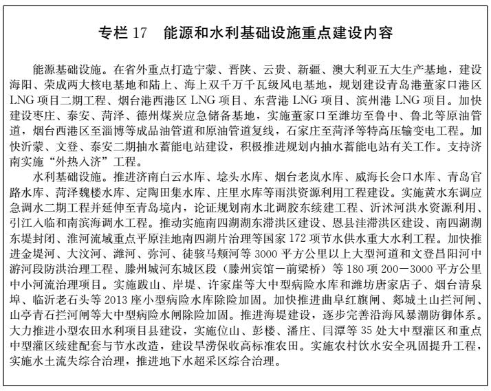 水利基礎(chǔ)設(shè)施。突出水資源的剛性約束,以節(jié)水、供水重大工程建設(shè)為重點(diǎn),構(gòu)筑水安全保障體系。論證規(guī)劃峽山水利膠東調(diào)水水源等工程,建設(shè)一批河道攔蓄工程和抗旱應(yīng)急水源工程。實(shí)施金堤河等河道重點(diǎn)河段治理,推進(jìn)病險(xiǎn)水庫水閘除險(xiǎn)加固,疏浚治理河湖水系,加強(qiáng)沿海7市海堤工程建設(shè),推進(jìn)黃河口治理,實(shí)施地下水超采區(qū)綜合治理工程。加強(qiáng)大中型灌區(qū)續(xù)建配套節(jié)水改造,加快小型農(nóng)田水利項(xiàng)目縣建設(shè)。