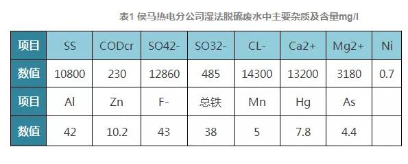 3.4 脫硫廢水:煙氣濕法脫硫過(guò)程產(chǎn)生的廢水來(lái)源于吸收塔排放水。為維持脫硫裝置將夜循環(huán)系統(tǒng)的物質(zhì)的平衡,需要定時(shí)從吸收塔排除廢水。我公司脫硫廢水中主要雜質(zhì)及其含量,PH值為6.7,其中有些物質(zhì)為國(guó)家環(huán)保標(biāo)準(zhǔn)要求嚴(yán)格控制的第一類污染物。具體指標(biāo)見(jiàn)下表。