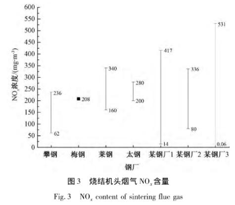 由燒結(jié)燃料(煤粉、焦粉)燃燒產(chǎn)生的燃料型NO,占燒結(jié)煙氣中NOx的90%以上。見(jiàn)圖3,我國(guó)燒結(jié)煙氣中NOx含量為100~500mg/m3,波動(dòng)較大。目前,燒結(jié)煙氣脫硝主要以活性炭/焦吸附為主。
