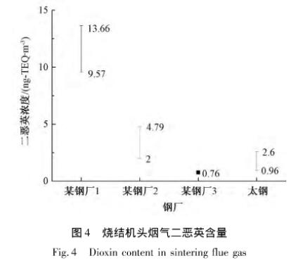 燒結(jié)過(guò)程中的二惡英主要由“從頭合成”途徑生成。燒結(jié)原料中含有的Fe、Cu、Cl等元素提供了催化劑和氯源;燃料的不充分燃燒提供了大分子碳源;燒結(jié)過(guò)程漏風(fēng)率高,含氧充足,在250~450℃,二惡英的“從頭合成”得以發(fā)生。目前國(guó)內(nèi)關(guān)于燒結(jié)煙氣中二惡英含量的報(bào)道較少,如圖4所示,不同燒結(jié)煙氣的二惡英排放量差別很大,可能跟原料與工況有關(guān)。