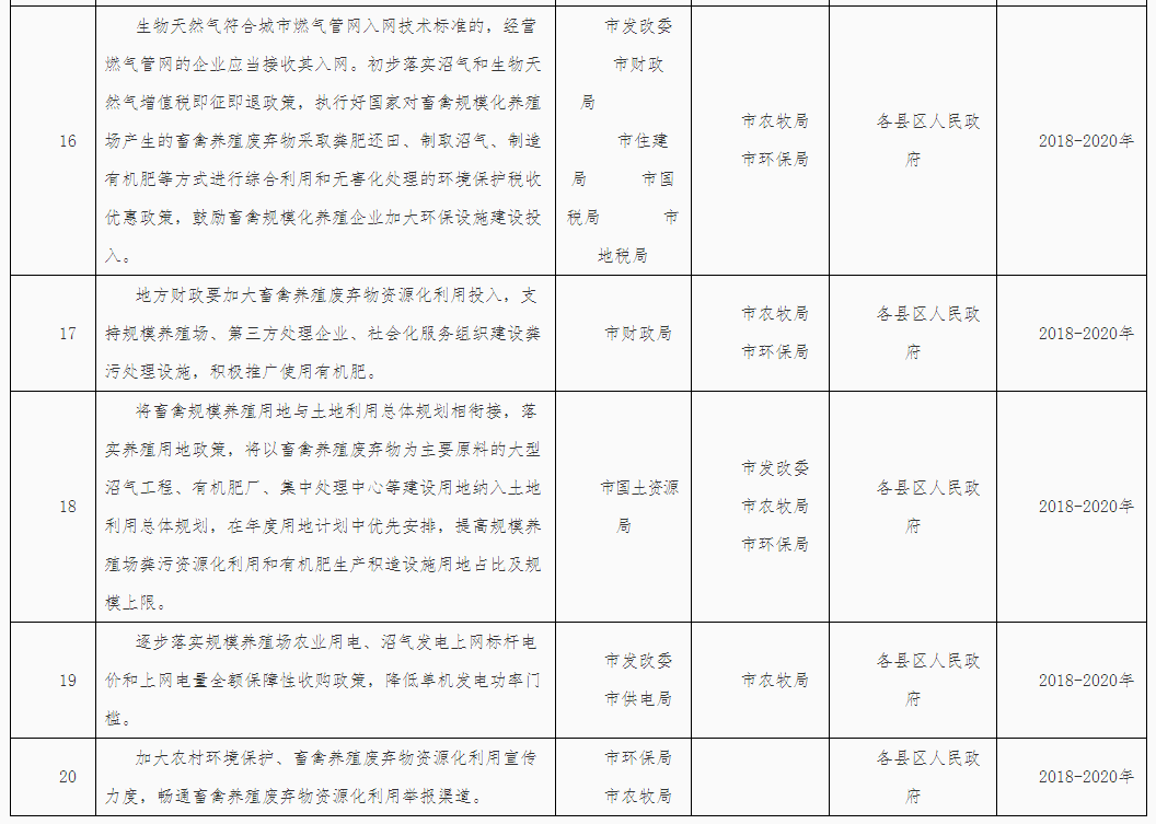 (五)推動(dòng)種養(yǎng)循環(huán)發(fā)展。各縣區(qū)要盡快編制種養(yǎng)循環(huán)發(fā)展規(guī)劃,引導(dǎo)建立糧飼統(tǒng)籌、農(nóng)牧結(jié)合、養(yǎng)防并重、種養(yǎng)一體的種養(yǎng)循環(huán)綠色發(fā)展機(jī)制,促進(jìn)畜牧業(yè)持續(xù)健康發(fā)展。推動(dòng)建立畜禽糞污等農(nóng)業(yè)有機(jī)廢棄物收集、轉(zhuǎn)化、利用網(wǎng)絡(luò)體系,支持采取政府和社會(huì)資本合作(PPP)模式,調(diào)動(dòng)社會(huì)資本在養(yǎng)殖密集區(qū)域建立糞污集中處理中心,探索規(guī)?;?、專(zhuān)業(yè)化、社會(huì)化運(yùn)營(yíng)機(jī)制,加快畜禽糞污處理全產(chǎn)業(yè)鏈建設(shè)。培育壯大多種類(lèi)型的糞污處理社會(huì)化服務(wù)組織,實(shí)行專(zhuān)業(yè)化生產(chǎn)、市場(chǎng)化運(yùn)營(yíng)。鼓勵(lì)建立受益者付費(fèi)機(jī)制,保障第三方處理企業(yè)和社會(huì)化服務(wù)組織合理收益。加強(qiáng)糞肥還田技術(shù)指導(dǎo),鼓勵(lì)沼液和經(jīng)無(wú)害化處理的畜禽養(yǎng)殖廢水作為肥料科學(xué)還田利用。優(yōu)先支持現(xiàn)代農(nóng)業(yè)示范區(qū)、農(nóng)業(yè)可持續(xù)發(fā)展試驗(yàn)示范區(qū)和現(xiàn)代農(nóng)業(yè)產(chǎn)業(yè)園在田間地頭配套建設(shè)管網(wǎng)和儲(chǔ)糞(液)池等方式,解決糞肥還田“最后一公里”問(wèn)題。到2020年新(改擴(kuò))建大中型沼氣21處,新(改擴(kuò))建有機(jī)肥生產(chǎn)企業(yè)5家。