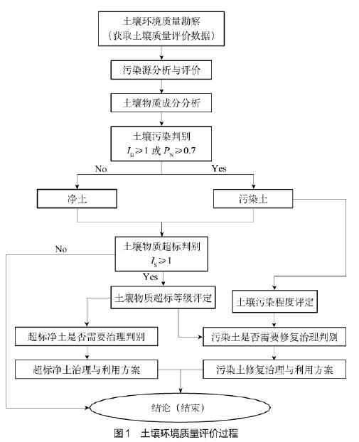 由圖1可知,土壤環(huán)境質(zhì)量評價包括土壤污染評價和土壤物質(zhì)符合環(huán)境質(zhì)量要求的評價兩部分內(nèi)容。其中,土壤污染評價主要包括土壤污染與否判別、土壤中致污物質(zhì)是否超標(biāo)判別與土壤污染程度評價。實施土壤環(huán)境質(zhì)量評價時,首先應(yīng)判別某土壤是否受到了某物質(zhì)的污染,即確定該土壤是污染土還是凈土。然后,對于凈土,應(yīng)進(jìn)一步判別某物質(zhì)成分是否符合土壤質(zhì)量標(biāo)準(zhǔn)要求,如果符合土壤環(huán)境如果不符合土壤環(huán)境質(zhì)量要求,應(yīng)進(jìn)一步研究土壤的利用或治理方法。對于污染土,應(yīng)首先判別致污物質(zhì)含量是否符合土壤環(huán)境質(zhì)量要求,如果致污物質(zhì)含量符合土壤環(huán)境質(zhì)量要求,給出結(jié)論并結(jié)束評價;如果致污物質(zhì)含量不符合土壤環(huán)境質(zhì)量要求,應(yīng)結(jié)合土壤污染程度評價結(jié)果,進(jìn)一步研究污染土利用、修復(fù)或治理方案。