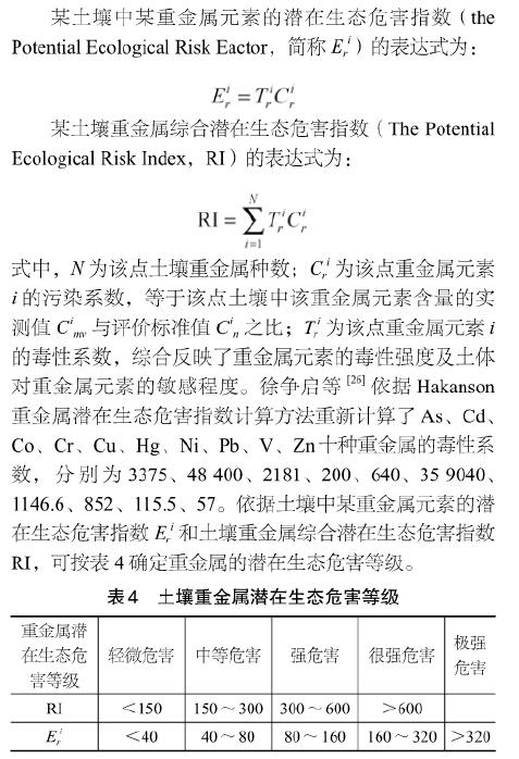 6)致污染物質(zhì)的潛在生態(tài)危害評價。潛在生態(tài)危害指數(shù)法是瑞典地球化學(xué)家Hakanson于1980[21]創(chuàng)建的,是以沉積學(xué)原理評價環(huán)境重金屬污染及其生態(tài)危害的方法。由于該方法同時考慮了重金屬的種類、濃度、毒性水平及土體對重金屬的敏感性等因素,較為科學(xué)合理,因此,被廣泛應(yīng)用于土壤環(huán)境質(zhì)量評價,國內(nèi)有不少學(xué)者[22-26]在評價土壤環(huán)境質(zhì)量時應(yīng)用了這種方法,并進(jìn)行了較深入的研究。
