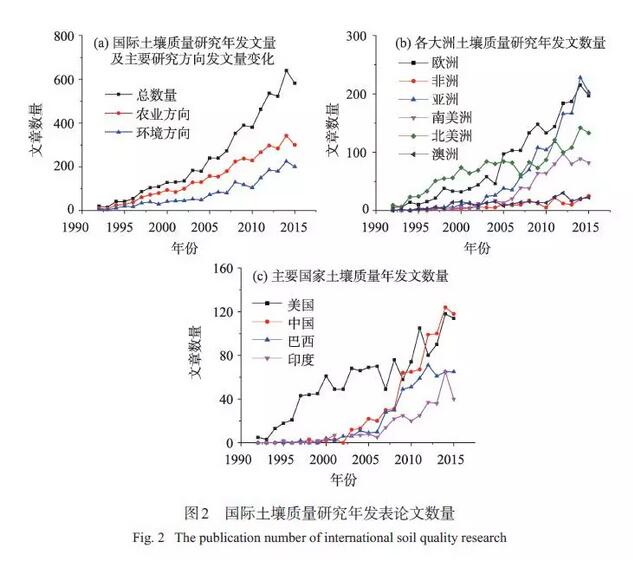 相對(duì)于發(fā)達(dá)國家,發(fā)展中國家人口眾多,人均資源匱乏,農(nóng)業(yè)管理也呈現(xiàn)農(nóng)戶個(gè)體經(jīng)營零碎化,管理方式不一致。而發(fā)達(dá)國家機(jī)械化大規(guī)模操作,使得農(nóng)業(yè)的管理趨于一致。從近幾年土壤質(zhì)量的研究趨勢來看,發(fā)展中國家尤其是中國在其中所占的比例日益增大。隨著全球一體化的快速推進(jìn),發(fā)展中國家對(duì)糧食安全和環(huán)境保護(hù)的訴求也愈加強(qiáng)烈。第十八屆國際土壤學(xué)大會(huì)指出,將來有兩個(gè)主要趨勢:在食物匱乏的國家,只要這種匱乏還存在,土壤科學(xué)主要就將致力于解決土壤肥力問題。不幸的是,這種威脅在非洲、亞洲和中南美洲都不斷增長。土壤質(zhì)量作為環(huán)境質(zhì)量、糧食安全與經(jīng)濟(jì)問題的紐帶,迎合了發(fā)展中國家的需求。