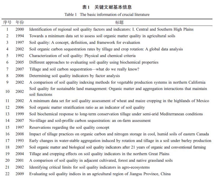 進(jìn)入20 世紀(jì)90 年代以來,國際上關(guān)于土壤質(zhì)量研究的文獻(xiàn)大量涌現(xiàn),涉及的學(xué)科和內(nèi)容非常廣泛。目前針對(duì)土壤質(zhì)量相關(guān)文獻(xiàn)的綜述已有不少,其中國外學(xué)者就土壤質(zhì)量概念與應(yīng)用、評(píng)價(jià)指標(biāo)、耕作、種植制度、作物殘茬管理對(duì)土壤質(zhì)量的影響等方面展開評(píng)述;國內(nèi)對(duì)土壤質(zhì)量研究綜述多集中在土壤質(zhì)量評(píng)價(jià)方法、指標(biāo)、標(biāo)準(zhǔn)以及可持續(xù)土地管理方面。這些研究綜述的發(fā)表對(duì)國內(nèi)外學(xué)者了解以及推動(dòng)土壤質(zhì)量研究發(fā)揮了重要作用。但是面對(duì)成千上萬的龐大文獻(xiàn)群,以文獻(xiàn)閱讀、總結(jié)歸納、定性探討為主要方法的傳統(tǒng)文獻(xiàn)綜述存在明顯的局限性,如Karlen 等、Sparrow 等、Sithole 等僅就土壤質(zhì)量的某個(gè)方面進(jìn)行了文獻(xiàn)綜述,其參考價(jià)值的高低也取決于研究者本身的研究水平,無法客觀、全面地反映該領(lǐng)域的發(fā)展脈絡(luò)以及研究趨勢。因此,還需要采用更為科學(xué)的方法對(duì)以上問題做進(jìn)一步的分析和探討。