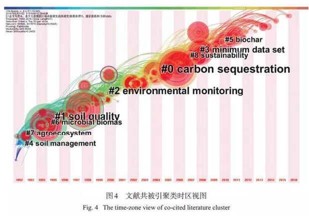 本研究中所認(rèn)為的“研究主題”是指在一定時(shí)段內(nèi),眾多學(xué)者探討和解決的中心問題,Citespace V通過對(duì)文獻(xiàn)共被引的分析,將研究內(nèi)容相似的文獻(xiàn)進(jìn)行歸類并命名。通過對(duì)5 551 篇文獻(xiàn)進(jìn)行共被引分析,共獲取28 個(gè)聚類,如果聚類中文獻(xiàn)數(shù)量較少,則會(huì)影響其命名的準(zhǔn)確性,因此本研究選取文獻(xiàn)數(shù)量在30 篇以上的8 個(gè)聚類進(jìn)一步分析,聚類的時(shí)間分布和命名見圖 4。通過圖4 可以發(fā)現(xiàn),研究早期(2000 年以前) 主題較為分散,主要集中在土壤管理(#4)、農(nóng)業(yè)生態(tài)系統(tǒng)(#7)、微生物生物量(#6)、土壤質(zhì)量概念(#1) 等方面,2000 年以來,環(huán)境監(jiān)測(#2)、碳匯(#0) 研究最多,另外近幾年焦點(diǎn)聚集在可持續(xù)性(#8)、最小數(shù)據(jù)集(#3)、生物炭(#5) 上。