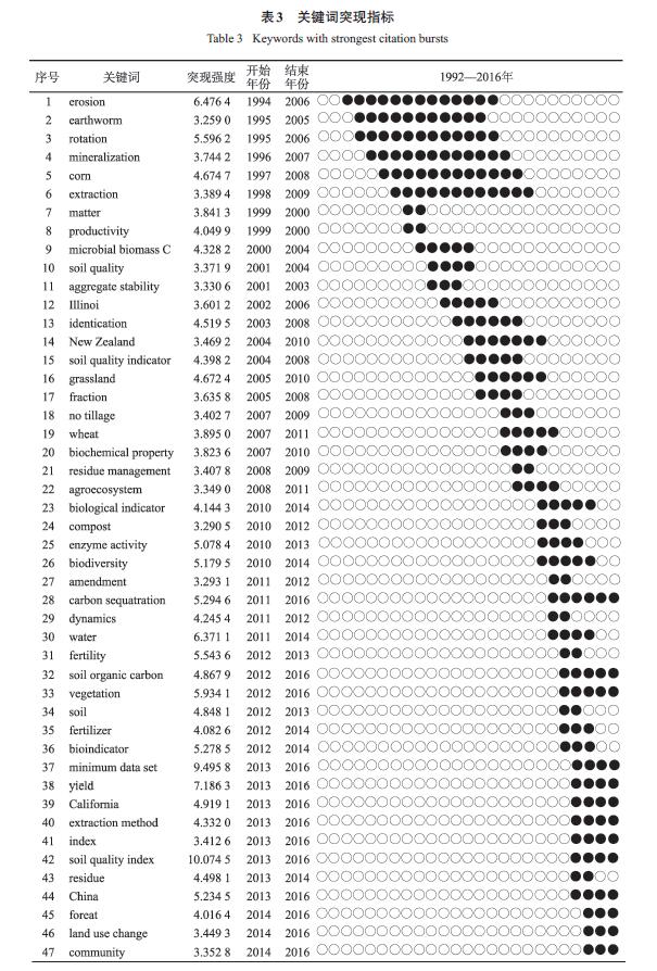 土壤質(zhì)量概念的產(chǎn)生與發(fā)展有著深刻的時(shí)代背景和需求。人類發(fā)展的階段性和動(dòng)態(tài)性、全球氣候變化與人類活動(dòng)影響的加劇、學(xué)科的不斷交融是決定土壤質(zhì)量主題演變的主要因素。土壤質(zhì)量在20 多年的發(fā)展階段中,涌現(xiàn)了一些標(biāo)志性的經(jīng)典文獻(xiàn),引發(fā)了大量學(xué)者關(guān)注,從而產(chǎn)生了新的研究點(diǎn)。依據(jù)Citespace V理論和分析結(jié)果,本文著重對(duì)文獻(xiàn)中心性高于0.03、突現(xiàn)性高于4、共被引頻次大于30 的關(guān)鍵文獻(xiàn)進(jìn)行分析,綜合以上量化指標(biāo),對(duì)該領(lǐng)域研究熱點(diǎn)及其變遷進(jìn)行了解析。在研究趨勢方面,截取突現(xiàn)性大于4,開始年份為2011年,結(jié)束年份為2016年的關(guān)鍵詞進(jìn)行了分析。