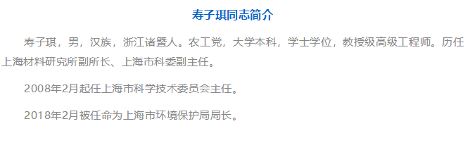 而上海市環(huán)保局局長壽子琪,則是典型的專家型官員,他是教授級(jí)高級(jí)工程師,歷任上海材料研究所副所長、上海市科學(xué)技術(shù)委員會(huì)副主任、上海市科學(xué)技術(shù)委員會(huì)主任。