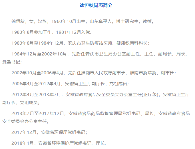 1月17日下午,安徽省第十二屆人民代表大會(huì)常務(wù)委員會(huì)第四十三次會(huì)議決定,任命徐恒秋為安徽省環(huán)境保護(hù)廳廳長。
