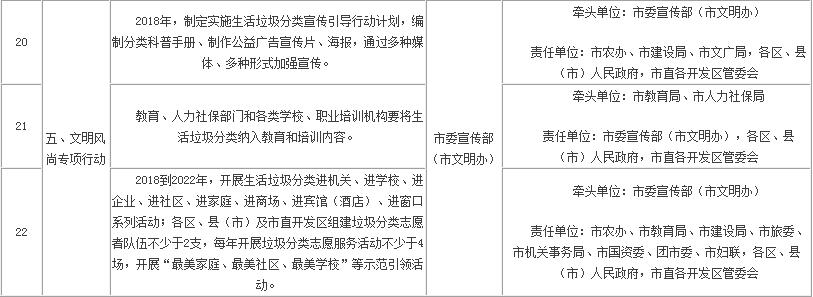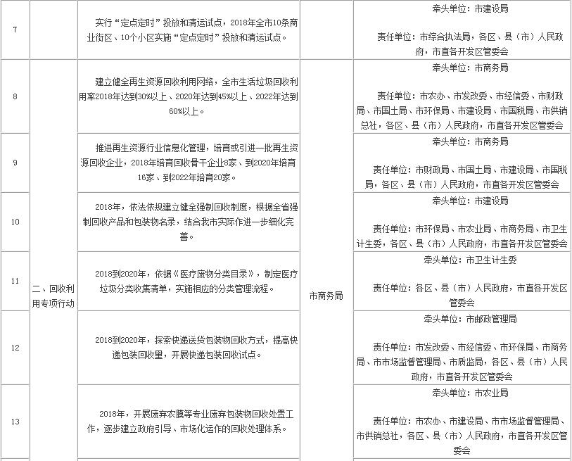 (一)一年細(xì)分目標(biāo)。2018年,全市生活垃圾增長率控制在2.5%以下;市區(qū)城區(qū)、縣(市)城區(qū)和農(nóng)村分類覆蓋面分別達(dá)到80%、60%和75%;全市黨政機(jī)關(guān)和企事業(yè)單位實施強(qiáng)制分類覆蓋面達(dá)到100%,全市城區(qū)社會組織、公共場所和相關(guān)企業(yè)實施強(qiáng)制分類覆蓋面達(dá)到80%;新增生活垃圾焚燒穩(wěn)定運行處置能力2250噸/日、餐廚垃圾處置能力500噸/日;新增省級高標(biāo)準(zhǔn)生活垃圾分類示范小區(qū)、示范村各25個;初步建立全市再生資源回收利用網(wǎng)絡(luò),其中培育回收骨干企業(yè)8家;完成城區(qū)范圍內(nèi)不符合規(guī)范要求的生活垃圾清運車輛和中轉(zhuǎn)站整治改造;市、縣兩級初步建立生活垃圾分類處理智能化大數(shù)據(jù)平臺;城鄉(xiāng)生活垃圾分類投放正確率穩(wěn)步提升,回收利用率、資源化利用率、無害化處理率分別達(dá)到30%以上、80%以上、100%。