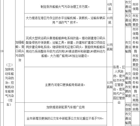 6. 加強(qiáng)船舶、港口碼頭污染防治。2018年6月底前,制定我市船舶大氣污染治理工作方案;2018年10月底前,大力推進(jìn)在港區(qū)內(nèi)作業(yè)的水平運(yùn)輸機(jī)械、裝載機(jī)、運(yùn)輸車輛采用“油改氣”技術(shù);2018年底前,完成大型貨運(yùn)碼頭靠港船舶岸電系統(tǒng)改造。推動(dòng)新建港口碼頭配備綠色環(huán)保裝載、運(yùn)輸工具。新建、改建和擴(kuò)建港口項(xiàng)目應(yīng)同步建設(shè)岸電系統(tǒng),繼續(xù)取締無證港口碼頭,鼓勵(lì)現(xiàn)有船舶采用動(dòng)力系統(tǒng)整體升級(jí)方式改用LNG清潔燃料和新建LNG燃料動(dòng)力船舶,大力推廣船用LNG加注站建設(shè)。2018年底前,主要內(nèi)河港口更換船用低硫油(硫含量不高于0.5%m/m的燃油)。(責(zé)任單位:各縣、區(qū)人民政府,亳州經(jīng)濟(jì)開發(fā)區(qū)管委會(huì)、亳蕪現(xiàn)代產(chǎn)業(yè)園區(qū)管委會(huì);牽頭部門:市交通運(yùn)輸局,配合部門:市環(huán)保局、市商務(wù)和糧食局、市發(fā)展改革委)
