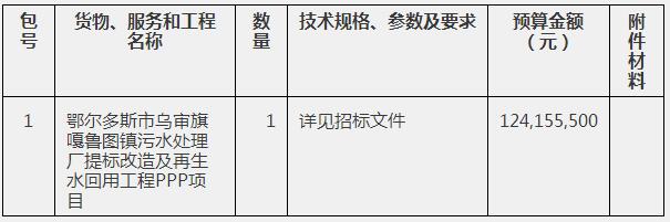 鄂爾多斯市烏審旗嘎魯圖鎮(zhèn)污水處理廠提標(biāo)改造及再生水回用工程PPP項(xiàng)目公開招標(biāo),預(yù)算1.24億元。公告如下: