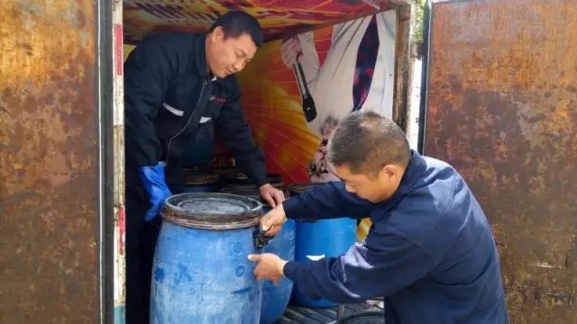 ④ “地溝油”被搬上專用收運車,一車裝滿可以放下十幾桶。
