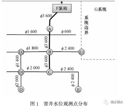 試驗(yàn)開始前,對(duì)F調(diào)蓄池實(shí)施徹底清淤。每次試驗(yàn)時(shí),一般每隔24 h開啟調(diào)蓄池,調(diào)蓄池蓄滿時(shí)間均在15 min左右。設(shè)計(jì)試驗(yàn)時(shí),在F泵站進(jìn)水總管、F系統(tǒng)邊界處,設(shè)置8個(gè)窨井水位觀測(cè)點(diǎn),分別為:位于總管上的A、B、C 3個(gè)點(diǎn);和B點(diǎn)直接相通的D2點(diǎn)、和B點(diǎn)直接相通且位于系統(tǒng)邊界處的E1點(diǎn);相對(duì)位于遠(yuǎn)端的、類似于進(jìn)水管“肩膀”處的D、E、D1等3個(gè)點(diǎn),詳見圖1。