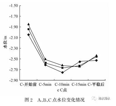 試驗(yàn)發(fā)現(xiàn),A、B、C、D2、E1等5個(gè)點(diǎn)的水位,會(huì)隨F調(diào)蓄池進(jìn)水至蓄滿而呈U型狀變化,以A、B、C為例(見圖2),基本都在10~15 min時(shí)水位變化最為明顯。但位于遠(yuǎn)端的D、E、D1等3個(gè)點(diǎn)幾乎未發(fā)生變化。由此可以初步判斷,F(xiàn)調(diào)蓄池對(duì)進(jìn)水總管的拉動(dòng),至C點(diǎn)結(jié)束,總長約1 200 m;調(diào)蓄池的運(yùn)行,僅對(duì)鄰近的管網(wǎng)起到了收水效果。