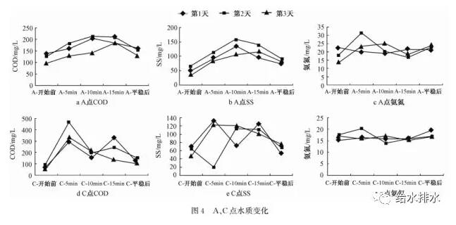更值得注意的是A、B、C、D2、E1這5個(gè)點(diǎn)的水質(zhì)變化,以A、C兩點(diǎn)為例(見圖4),在15 min的進(jìn)水過程中,隨著水位突降,COD和SS呈現(xiàn)出一個(gè)突增趨勢(shì),氨氮卻相對(duì)平穩(wěn)。同時(shí),調(diào)蓄池內(nèi)的水質(zhì)也大致如此,COD和SS在最后一天時(shí)達(dá)到最大值,而氨氮卻總體穩(wěn)定。