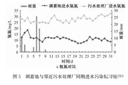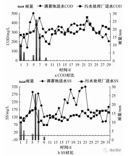 汛后試驗(yàn)的水質(zhì)監(jiān)測(cè)對(duì)象是調(diào)蓄池進(jìn)水,將其與同期污水處理廠進(jìn)水水質(zhì)比較,結(jié)果見圖5。