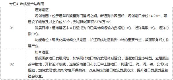 推進(jìn)岸線整合與利用。提升開發(fā)利用區(qū)岸線使用效率,合理安排港口岸線、過江通道岸線、取排水口岸線??刂葡嚓P(guān)企業(yè)無序占用岸線,推進(jìn)公共碼頭建設(shè)。港口工業(yè)生產(chǎn)岸線騰退轉(zhuǎn)移,生活、生態(tài)岸線空間穩(wěn)步增加,實(shí)現(xiàn)“三生”空間有序發(fā)展,統(tǒng)籌重要過江通道岸線的控制預(yù)留。加快沿江原南通港區(qū)、任港港區(qū)、狼山港區(qū)、富民港區(qū)以及江海港區(qū)的分期轉(zhuǎn)移和整合,形成沿江五港區(qū)的總體格局。嚴(yán)控新增港口岸線利用,取消或調(diào)整與水源保護(hù)、生態(tài)紅線區(qū)域等有沖突的港口碼頭。對(duì)一些開發(fā)布局不合理、未按國(guó)家有關(guān)規(guī)定、不符合規(guī)劃的開發(fā)利用項(xiàng)目逐步加以糾正。對(duì)涉及岸線利用的各類違法違規(guī)行為,重點(diǎn)清理整頓,逐步消除存量,堅(jiān)決遏制增量。依法取締不具備安全生產(chǎn)條件、不符合環(huán)境保護(hù)要求的非法碼頭和裝卸點(diǎn),到2020年,沿江非法碼頭徹底消除。建立健全長(zhǎng)江岸線保護(hù)和開發(fā)利用協(xié)調(diào)機(jī)制,統(tǒng)籌岸線與后方土地的使用和管理。探索建立岸線資源有償使用制度。