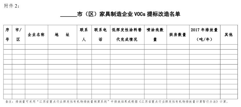 2018年底前,完成全市現(xiàn)有家具制造業(yè)企業(yè)VOCs提標(biāo)改造治理,提升我市家具制造行業(yè)的VOCs治理水平,全面按期達(dá)到《表面涂裝(家具制造業(yè))揮發(fā)性有機(jī)物排放標(biāo)準(zhǔn)》(DB32/3152-2016)(以下簡(jiǎn)稱“標(biāo)準(zhǔn)”)要求,減少VOCs排放總量。