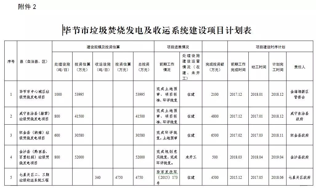 (一)項目攻堅(2018—2019年),集中解決垃圾處理設(shè)施短板。規(guī)劃建設(shè)城鄉(xiāng)垃圾收運處理設(shè)施,新增垃圾處理能力4400噸/日,新增垃圾轉(zhuǎn)運能力3500噸/日。七星關(guān)區(qū)、金沙縣85%以上行政村垃圾得到有效治理,其他縣(自治縣、區(qū))80%以上行政村垃圾得到有效治理。