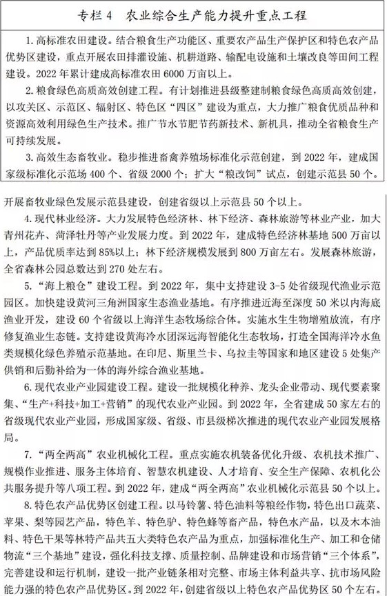 (三)提高農(nóng)業(yè)水利化機(jī)械化水平。大力實(shí)施農(nóng)田水利工程,推進(jìn)大中型灌區(qū)續(xù)建配套與節(jié)水改造,因地制宜興建、提升中小型農(nóng)田水利設(shè)施,打通農(nóng)田水利“最后一公里”,加快建設(shè)現(xiàn)代農(nóng)田灌排體系。發(fā)展節(jié)水農(nóng)業(yè)、旱作農(nóng)業(yè),加快推廣水肥一體化,加大地下水超采區(qū)綜合整治力度。2022年基本完成35處大型灌區(qū)和一批重點(diǎn)中小型灌區(qū)續(xù)建配套節(jié)水改造任務(wù),農(nóng)業(yè)灌溉水有效利用系數(shù)達(dá)到0.646,有效灌溉面積達(dá)到8000萬畝。圍繞推進(jìn)“全程、全面、高質(zhì)、高效”農(nóng)業(yè)機(jī)械化,調(diào)整優(yōu)化農(nóng)機(jī)裝備結(jié)構(gòu)布局,優(yōu)先發(fā)展大馬力、高性能、復(fù)式作業(yè)機(jī)械,大力發(fā)展智能化、高端農(nóng)機(jī)裝備。促進(jìn)農(nóng)機(jī)農(nóng)藝融合,提高農(nóng)機(jī)裝備智能決策和精準(zhǔn)作業(yè)能力,推進(jìn)糧食機(jī)械化干燥,示范推廣棉花機(jī)采、花生機(jī)播機(jī)收等關(guān)鍵環(huán)節(jié)技術(shù),推動糧棉油等主要農(nóng)作物生產(chǎn)全程機(jī)械化。加快推廣林牧漁生產(chǎn)、病蟲害防治、節(jié)水灌溉和農(nóng)產(chǎn)品初加工機(jī)械化。2022年農(nóng)作物耕種收綜合機(jī)械化率達(dá)到88%。