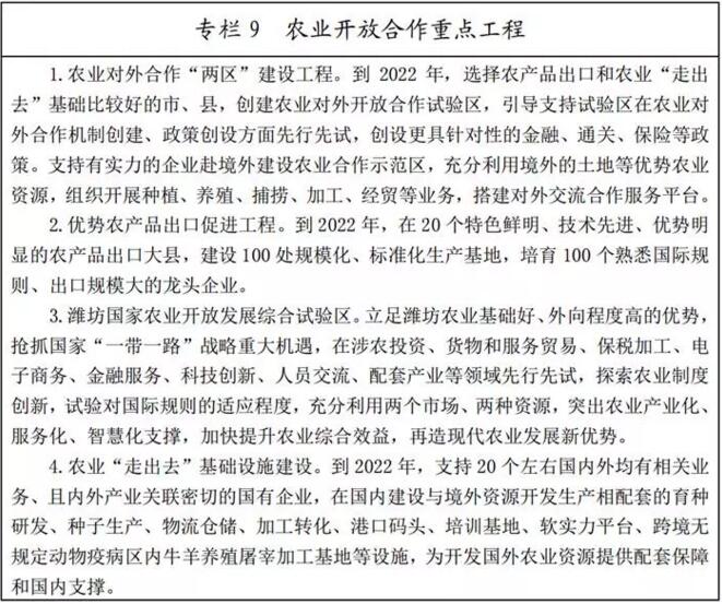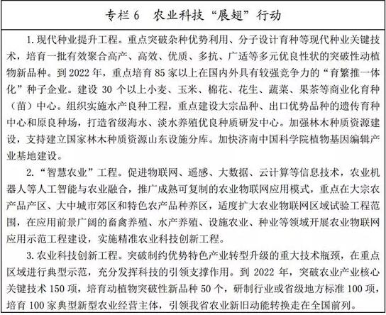 (一)提升農(nóng)業(yè)科技創(chuàng)新能力。積極爭取國家級涉農(nóng)科研機(jī)構(gòu)在山東布局分支機(jī)構(gòu),加快濰坊北京大學(xué)現(xiàn)代農(nóng)業(yè)研究院建設(shè)。強(qiáng)化全省農(nóng)業(yè)高校、科研院所、農(nóng)產(chǎn)品加工大企業(yè)研發(fā)中心等各類農(nóng)業(yè)科技資源整合和集成,搭建農(nóng)科教創(chuàng)新平臺,建設(shè)一批省級以上農(nóng)業(yè)重點(diǎn)實(shí)驗(yàn)室和技術(shù)創(chuàng)新中心,造就一批具有較強(qiáng)國際競爭力的創(chuàng)新型領(lǐng)軍企業(yè),全面提升農(nóng)業(yè)科技創(chuàng)新能力和核心競爭力。多管齊下引進(jìn)對我省現(xiàn)代農(nóng)業(yè)產(chǎn)業(yè)發(fā)展有重大影響的創(chuàng)新科研團(tuán)隊(duì)和海內(nèi)外高層次農(nóng)業(yè)科技人才。通過政策扶持、項(xiàng)目匹配、資金資助等方式,深入實(shí)施農(nóng)業(yè)科研杰出人才計劃和杰出青年農(nóng)業(yè)科學(xué)家項(xiàng)目,培養(yǎng)一批科技領(lǐng)軍人才和高水平創(chuàng)新創(chuàng)業(yè)團(tuán)隊(duì)。完善首席專家、農(nóng)業(yè)技術(shù)推廣人員和新型經(jīng)營主體的聯(lián)動機(jī)制,探索建立“創(chuàng)新團(tuán)隊(duì)+基層農(nóng)技推廣體系+新型職業(yè)農(nóng)民培育”的新型農(nóng)業(yè)科技服務(wù)模式。扎實(shí)推進(jìn)農(nóng)業(yè)科技園區(qū)體系建設(shè),提升綜合創(chuàng)新能力和服務(wù)水平。將黃河三角洲農(nóng)業(yè)高新技術(shù)產(chǎn)業(yè)示范區(qū)建成具有全國影響力的農(nóng)業(yè)科技園區(qū),在部分領(lǐng)域形成世界領(lǐng)先的高科技產(chǎn)業(yè)。到2022年,力爭全省農(nóng)業(yè)高新技術(shù)企業(yè)達(dá)到1000家左右,培育一批產(chǎn)業(yè)規(guī)模超10億元的優(yōu)勢產(chǎn)業(yè),形成年銷售收入超100億元的特色優(yōu)勢產(chǎn)業(yè)集群,農(nóng)業(yè)科技進(jìn)步貢獻(xiàn)率達(dá)到66%左右。