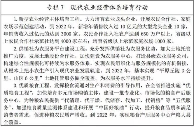 (一)延伸整合產(chǎn)業(yè)鏈。深化農(nóng)業(yè)產(chǎn)業(yè)化經(jīng)營,加快推動農(nóng)業(yè)“接二連三”,促進(jìn)立體化、復(fù)合式全產(chǎn)業(yè)鏈發(fā)展,推進(jìn)不同類型農(nóng)業(yè)產(chǎn)業(yè)鏈延伸整合,提升產(chǎn)業(yè)鏈整體競爭力。發(fā)揮農(nóng)業(yè)龍頭企業(yè)在全產(chǎn)業(yè)鏈布局中的關(guān)鍵作用,培育產(chǎn)業(yè)鏈領(lǐng)軍企業(yè),促進(jìn)農(nóng)業(yè)生產(chǎn)、加工、物流、研發(fā)和服務(wù)相互融合,推動產(chǎn)前、產(chǎn)中、產(chǎn)后一體化發(fā)展。強(qiáng)化農(nóng)業(yè)生產(chǎn)性服務(wù)業(yè)對現(xiàn)代農(nóng)業(yè)產(chǎn)業(yè)鏈的引領(lǐng)支撐作用,做大做強(qiáng)一批具有一定綜合實(shí)力的農(nóng)業(yè)服務(wù)業(yè)企業(yè),構(gòu)建全程覆蓋、區(qū)域集成的新型農(nóng)業(yè)社會化服務(wù)體系,帶動農(nóng)業(yè)產(chǎn)業(yè)鏈全面升級。培育和發(fā)展農(nóng)商產(chǎn)業(yè)聯(lián)盟、農(nóng)業(yè)產(chǎn)業(yè)化聯(lián)合體等新型產(chǎn)業(yè)鏈主體,打造一批產(chǎn)加銷一體的全產(chǎn)業(yè)鏈企業(yè)集群。鼓勵有條件的地方發(fā)展總部經(jīng)濟(jì),引進(jìn)國內(nèi)外集團(tuán)總部或區(qū)域總部,促進(jìn)產(chǎn)業(yè)鏈條向高端延伸。到2022年,全省農(nóng)產(chǎn)品加工業(yè)產(chǎn)值與農(nóng)林牧漁業(yè)總產(chǎn)值之比達(dá)到3.8∶1。