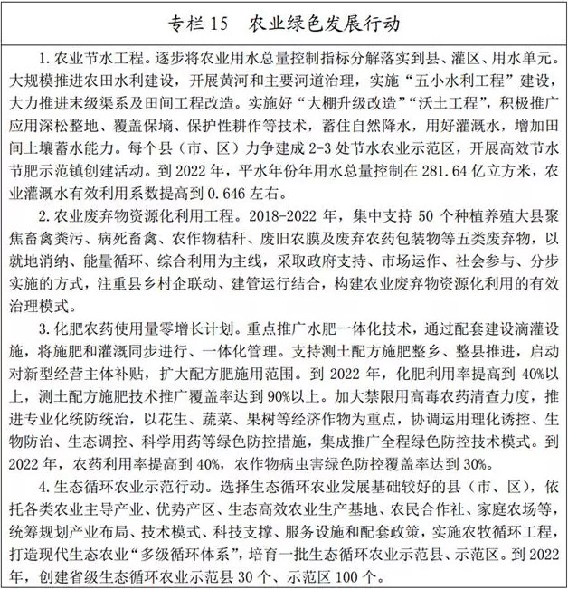 (二)推進(jìn)農(nóng)業(yè)清潔生產(chǎn)。實(shí)施化肥、農(nóng)藥減量增效行動,全面推廣測土配方施肥技術(shù),強(qiáng)化化肥、農(nóng)藥、獸藥、飼料添加劑等投入品使用管理,推進(jìn)病蟲害統(tǒng)防統(tǒng)治和綠色防控。大力實(shí)施種養(yǎng)業(yè)循環(huán)一體化工程,加快規(guī)?;笄蒺B(yǎng)殖場區(qū)糞污處理設(shè)施建設(shè)與標(biāo)準(zhǔn)化改造,推動規(guī)模化大型沼氣建設(shè),散養(yǎng)密集區(qū)逐步實(shí)現(xiàn)畜禽糞便污水分戶收集、集中處理利用,開展有機(jī)肥替代化肥試點(diǎn)。到2022年全省畜禽糞污綜合利用率達(dá)到81%,規(guī)模養(yǎng)殖場糞污處理設(shè)施裝備配套率達(dá)到100%。以縣為單位推進(jìn)農(nóng)業(yè)廢棄物資源化利用試點(diǎn),推廣秸稈高效利用模式,到2022年全省主要農(nóng)作物秸稈綜合利用率達(dá)到92%。推進(jìn)廢舊地膜、微灌材料和包裝廢棄物等回收處理,開展地膜使用全回收、機(jī)械化免膜生產(chǎn)、消除土壤殘留等試點(diǎn)。創(chuàng)建一批國家農(nóng)業(yè)可持續(xù)發(fā)展試驗(yàn)示范區(qū)。