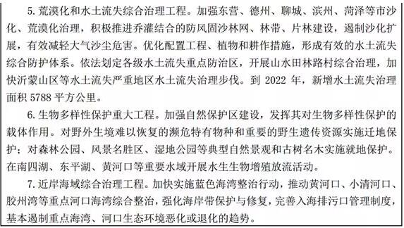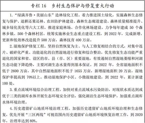 (二)實(shí)施生態(tài)修復(fù)重大工程。實(shí)施濕地修復(fù)工程,對集中連片、破碎化嚴(yán)重、功能退化的自然濕地進(jìn)行修復(fù)和綜合整治,有效遏制自然濕地萎縮和河湖生態(tài)功能下降趨勢。開展沙化荒漠化治理,以東營、德州、聊城、濱州、菏澤五市為重點(diǎn),積極推進(jìn)喬灌結(jié)合的防風(fēng)固沙林網(wǎng)、林帶、片林建設(shè)。推進(jìn)荒山、荒溝、荒灘整治修復(fù)。積極推進(jìn)泰山山水林田湖生態(tài)修復(fù)國家試點(diǎn)工程。支持長島海洋生態(tài)保護(hù)和持續(xù)發(fā)展。支持資源型城市開展生態(tài)修復(fù)工作,實(shí)施礦山環(huán)境治理恢復(fù),持續(xù)推進(jìn)采煤塌陷地治理。強(qiáng)化農(nóng)業(yè)防災(zāi)減災(zāi)能力建設(shè),提高抵御洪澇災(zāi)害、氣象災(zāi)害等應(yīng)急處置水平。