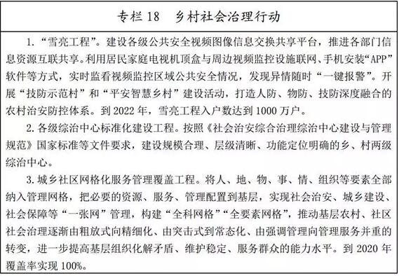 (三)全面推進(jìn)平安智慧鄉(xiāng)村建設(shè)。加強(qiáng)治安突出問題排查整治,深入開展掃黑除惡專項(xiàng)斗爭,嚴(yán)厲打擊農(nóng)村黑惡勢力、宗族惡勢力,嚴(yán)厲打擊黃賭毒盜拐騙等違法犯罪。依法加大對農(nóng)村非法宗教活動和境外滲透活動打擊力度,依法制止利用宗教干預(yù)農(nóng)村公共事務(wù)。借鑒推廣浙江“楓橋經(jīng)驗(yàn)”,創(chuàng)新群眾工作方法,健全完善村居、社區(qū)人民調(diào)解組織網(wǎng)絡(luò),全面推行智慧民調(diào)系統(tǒng),善于運(yùn)用法治思維和法治方式解決涉及群眾切身利益的矛盾和問題。落實(shí)社區(qū)服刑人員、刑滿釋放人員管理制度,健全政府主導(dǎo)、社會參與、家庭扶持的幫扶機(jī)制,使其盡快融入社會,預(yù)防重新違法犯罪。加強(qiáng)反邪教、社區(qū)戒毒、嚴(yán)重精神障礙患者服務(wù)管理工作,對鄉(xiāng)村留守老人、婦女兒童等強(qiáng)化服務(wù)教育,提高其自我防范意識和能力。強(qiáng)化網(wǎng)格化管理,深入實(shí)施“雪亮工程”,繼續(xù)深化平安智慧村莊(社區(qū))創(chuàng)建活動,構(gòu)建人防、技防、物防深度融合的農(nóng)村治安防控體系。強(qiáng)化鄉(xiāng)村安全生產(chǎn)監(jiān)管,防范各類事故發(fā)生。