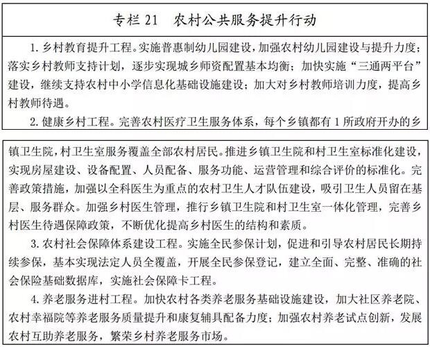 (三)實(shí)施數(shù)字鄉(xiāng)村戰(zhàn)略。綜合運(yùn)用多種技術(shù)手段,持續(xù)推進(jìn)農(nóng)村地區(qū)移動和固定寬帶網(wǎng)絡(luò)建設(shè)。引導(dǎo)移動、聯(lián)通、電信和廣電等電信運(yùn)營企業(yè)加大農(nóng)村網(wǎng)絡(luò)建設(shè)投資,進(jìn)一步提高農(nóng)村地區(qū)光纖寬帶接入能力,到2020年,農(nóng)村家庭基本具備100M以上接入能力。加大對農(nóng)村移動通信基站鐵塔建設(shè)的支持力度,擴(kuò)大4G無線網(wǎng)絡(luò)覆蓋范圍,推動5G網(wǎng)絡(luò)布局和商用進(jìn)程,基本實(shí)現(xiàn)農(nóng)村地區(qū)移動寬帶網(wǎng)絡(luò)人口全覆蓋。落實(shí)農(nóng)村地區(qū)網(wǎng)絡(luò)提速降費(fèi)政策,鼓勵電信運(yùn)營企業(yè)推出面向貧困戶的網(wǎng)絡(luò)資費(fèi)優(yōu)惠。建設(shè)信息進(jìn)村入戶平臺,完善農(nóng)村消費(fèi)信息服務(wù)、市場信息服務(wù)、“三農(nóng)”政策服務(wù)、農(nóng)村生活服務(wù)等系統(tǒng)和手機(jī)APP,推進(jìn)服務(wù)手段向移動終端延伸,服務(wù)方式向精準(zhǔn)投放轉(zhuǎn)變。推動遠(yuǎn)程醫(yī)療、遠(yuǎn)程教育等應(yīng)用普及,建立空間化、智能化的新型農(nóng)村統(tǒng)計信息綜合服務(wù)系統(tǒng),彌合城鄉(xiāng)數(shù)字鴻溝。