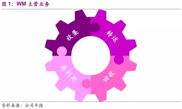 美國廢物管理公司 (Waste Management, Inc.,以下簡稱WM)成立于1968年,經過多年的成長和發(fā)展,從數(shù)個小型垃圾收集站逐步發(fā)展為全球固廢的絕對龍頭。公司在目前在美國和加拿大地區(qū)為市政、商業(yè)、工業(yè)及居民客戶提供廢品管理服務,包括收集、轉運、再利用、資源回收服務。