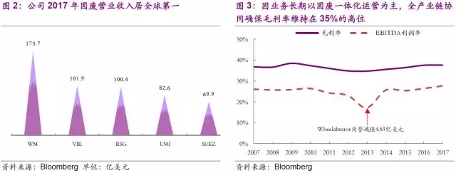 截止2018年5月23日,WM市值達357億美元。公司2017年垃圾處理量高達1.13億噸,實現(xiàn)營業(yè)收入145億美元,EBIT和EBITDA分別為26和40億美元。公司2017年固廢營業(yè)收入居全球第一,領先第二名威立雅達70%,而這一切都建立在公司僅在美國和加拿大運營的基礎上,充分展現(xiàn)出公司在固廢領域的絕對統(tǒng)治力。