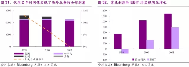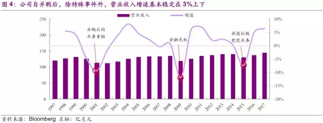 公司在1998年底合并后便堅決的采用了收益導向策略來優(yōu)化公司業(yè)務結構,首當其沖調整的便是海外業(yè)務。北美外業(yè)務是助力公司成為全球最大固廢公司的核心驅動之一,為公司帶來了可觀的營業(yè)收入。但是隨著競爭的逐步加大,北美外業(yè)務的營業(yè)利潤逐步下滑。公司僅用2年時間便基本完成了海外業(yè)務的剝離,這一切還是發(fā)生在美國和加拿大營業(yè)收入同步下滑的基礎上,可見公司的決心。更值得稱道的是,2年間公司營業(yè)利潤實現(xiàn)了明顯增長,股價也隨之走高,充分體現(xiàn)出了收益導向策略的成功之處。