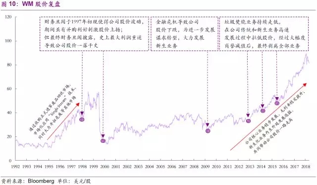 公司的發(fā)展之路并非一帆風順。通過1970—1990年間的大肆并購擴張,從傳統(tǒng)的收集轉運領域拓展到回收、危廢等市場,公司成功成為全球第一的固廢公司。但因擴張過快、戰(zhàn)略不當?shù)纫蛩?,公司?999年被市值和營業(yè)收入遠小于自己的USA Waste Services Inc并購,財務丑聞事件最終被披露也使得公司股價一落千丈。合并后的公司并沒有從此一蹶不振,而是通過不斷優(yōu)化公司經營策略,聚焦核心主業(yè)的同時大力發(fā)展新生化業(yè)務,引領公司一路走高至目前的近400億美元市值。