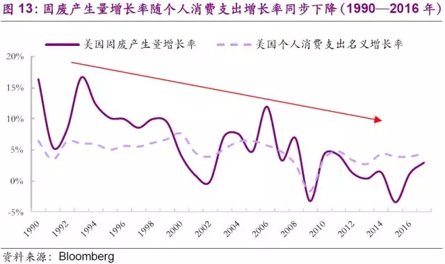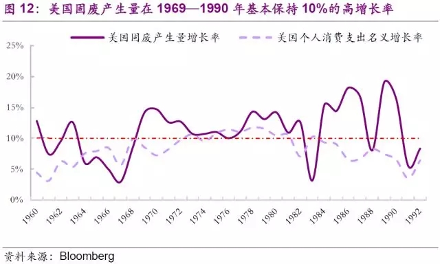 二戰(zhàn)后,美國新技術革命的推動(主要原因)與國民經濟的軍事化(越南戰(zhàn)爭)極大地刺激了經濟的增長。利用戰(zhàn)后經濟優(yōu)勢地位和國外廉價資源(石油等),美國的現(xiàn)代跨國公司大力拓展世界市場,極大地獲取高額利潤,使得美國國內經濟持續(xù)發(fā)展,西部和南部呈現(xiàn)繁榮之象并且造就了一個黃金時代。高速發(fā)展的黃金時期,美國居民生活水平持續(xù)提高,個人消費增速明顯,進而帶動固廢量持續(xù)走高,這段時期也是固廢行業(yè)蓬勃發(fā)展的第三階段。
