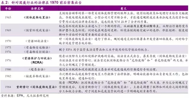 雖然以上法律法規(guī)的頒布和公司所處的固廢行業(yè)并無太大的關聯(lián),但這段時期環(huán)保領域法律法規(guī)的密集出臺,拉開了美國政府正式通過行政干預環(huán)境治理以及扶持環(huán)保產業(yè)崛起的序幕,對固廢行業(yè)的發(fā)展打下了堅實的基礎。