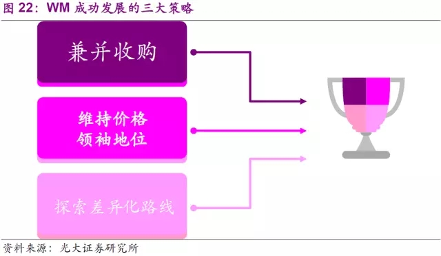 縱觀WM發(fā)展的歷史,它既享受到外部經濟和行業(yè)高速發(fā)展所帶來的廣闊市場,也需經歷經濟危機和市場轉型所帶來的陣痛。公司為搶占市場份額,穩(wěn)固龍頭地位,實現(xiàn)股東最大化方面做出了多方面努力,制定了各類執(zhí)行策略以期達到目標,而我們認為其中最重要的是三項策略,也是我們將進一步細致分析的,即兼并收購,維持價格領袖地位,以及探索差異化路線。