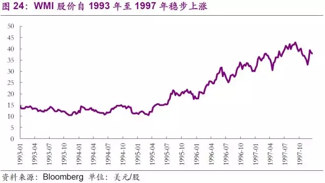 進入90年代,公司不滿足于現(xiàn)有的業(yè)務模式,意圖通過繼續(xù)的并購開拓多元化市場。然而結果卻超出了公司的預想。公司于1993年更名為WMX Technologies,意在體現(xiàn)公司多元化的業(yè)務范圍。通過收購,公司先后進入危廢、石棉移除、金屬腐蝕處理、甚至是草坪養(yǎng)護市場。與之前的垃圾焚燒和垃圾回收不同的是,上述行業(yè)在初期均需要大量資金投入,回報卻極其有限。公司的多領域擴張在一開始收到了回報,股價從1993年初的8.87美元一路上揚至1997年初的18.86美元,漲幅達112%。