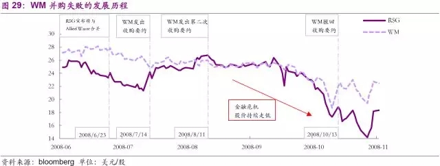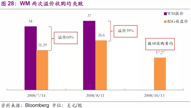值得注意的是公司發(fā)起收購的時間。2008年6月23日,RSG宣布將與Allied Waste合并,而當時Allied Waste和RSG分別是美國第二、第三大固廢公司。消息宣布后一個月內,WM就向RSG提出了收購要約,但未能實現(xiàn)。