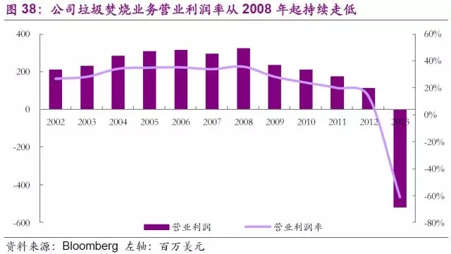 一步分析,Wheelabrator營業(yè)收入走低的核心因素是垃圾焚燒發(fā)電上網電價的持續(xù)下跌。再加上Wheelabrator原來簽訂的數(shù)個高于現(xiàn)上網電價的長期合同到期,需要按現(xiàn)行電價重新續(xù)簽,公司認為Wheelabrator已無法為公司提供穩(wěn)定的收益,并在2013年確認了高達4.83億美元的商譽減值,隨后于2014年宣布剝離Wheelabrator的全部業(yè)務。