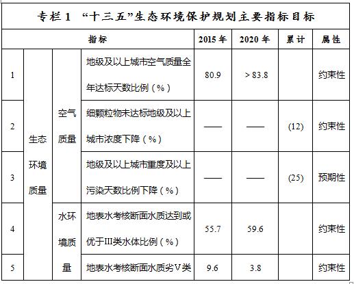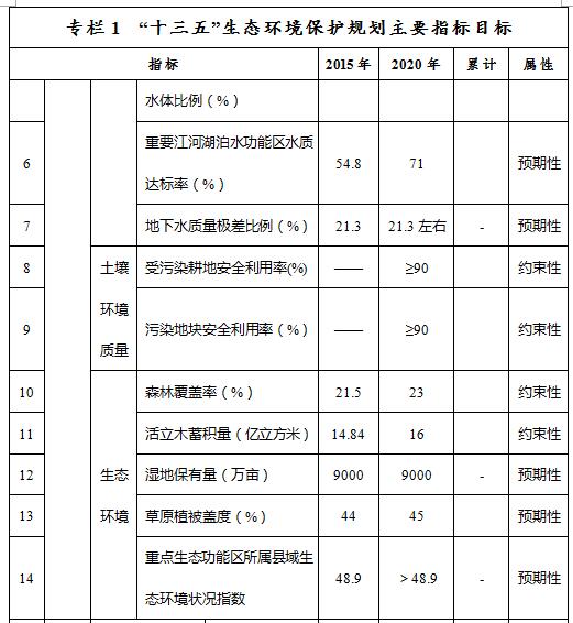 ——環(huán)境質(zhì)量控制目標(biāo)指標(biāo)。到2020年,大氣環(huán)境質(zhì)量方面,地級及以上城市空氣質(zhì)量全年達(dá)標(biāo)天數(shù)比例平均達(dá)到83.8%以上,重度及以上污染天數(shù)比例下降25%,未達(dá)標(biāo)地級及以上城市PM2.5年均濃度下降12%。水環(huán)境質(zhì)量方面,全區(qū)地表水質(zhì)量考核斷面水質(zhì)達(dá)到或優(yōu)于Ⅲ類比例總體達(dá)到59.6%,劣Ⅴ類水質(zhì)比例控制在3.8%,重要江河湖泊水功能區(qū)水質(zhì)達(dá)標(biāo)率達(dá)到71%,全區(qū)地下水質(zhì)量考核點(diǎn)位水質(zhì)級別保持穩(wěn)定且極差比例控制在21.3%。土壤環(huán)境質(zhì)量方面,全區(qū)土壤環(huán)境質(zhì)量總體保持穩(wěn)定,農(nóng)用地和建設(shè)用地土壤環(huán)境安全得到基本保障,受污染耕地安全利用率和污染地塊安全利用率均達(dá)到90%以上。生態(tài)環(huán)境質(zhì)量方面,森林覆蓋率達(dá)23%,活立木蓄積量達(dá)16億立方米,濕地保有量達(dá)9000萬畝,草原植被蓋度達(dá)到45%,重點(diǎn)生態(tài)功能區(qū)所屬縣域生態(tài)環(huán)境狀況指數(shù)達(dá)到48.9以上。